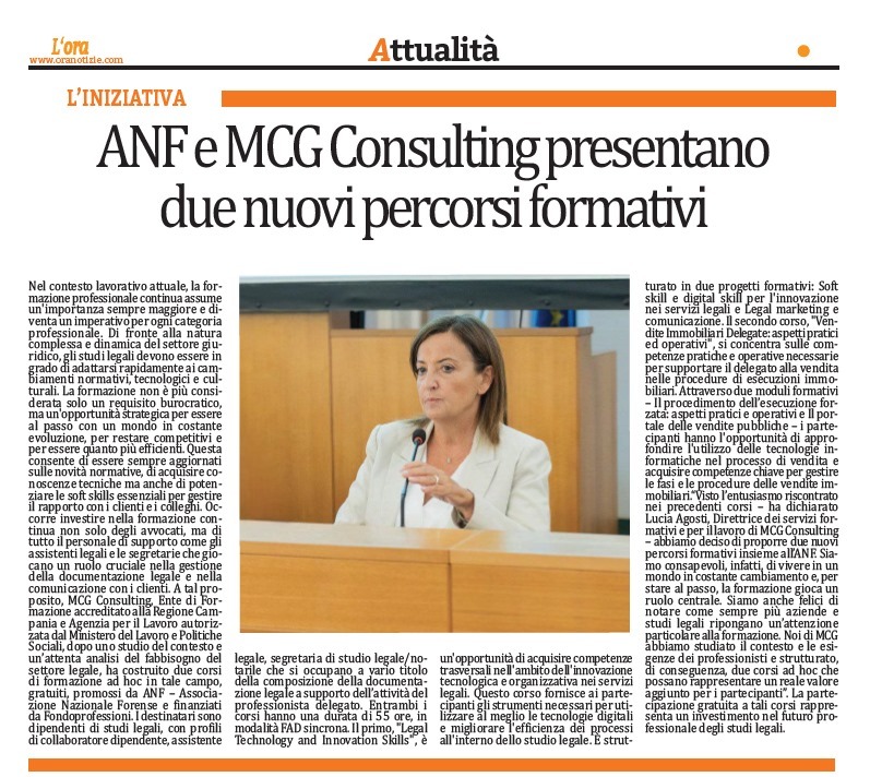 Il quotidiano L’Ora dedica ampio spazio ai percorsi formativi rivolti agli studi legali, organizzati da MCG Consulting e promossi dall’Associazione Nazionale Forense (ANF) e finanziati da Fondoprofessioni. In un contesto lavorativo in continua evoluzione, la formazione professionale assume un’importanza sempre maggiore e diventa un imperativo per ogni categoria professionale. Di fronte alla complessità e dinamicità del settore giuridico, gli studi legali devono essere in grado di adattarsi rapidamente ai cambiamenti normativi, tecnologici e culturali.