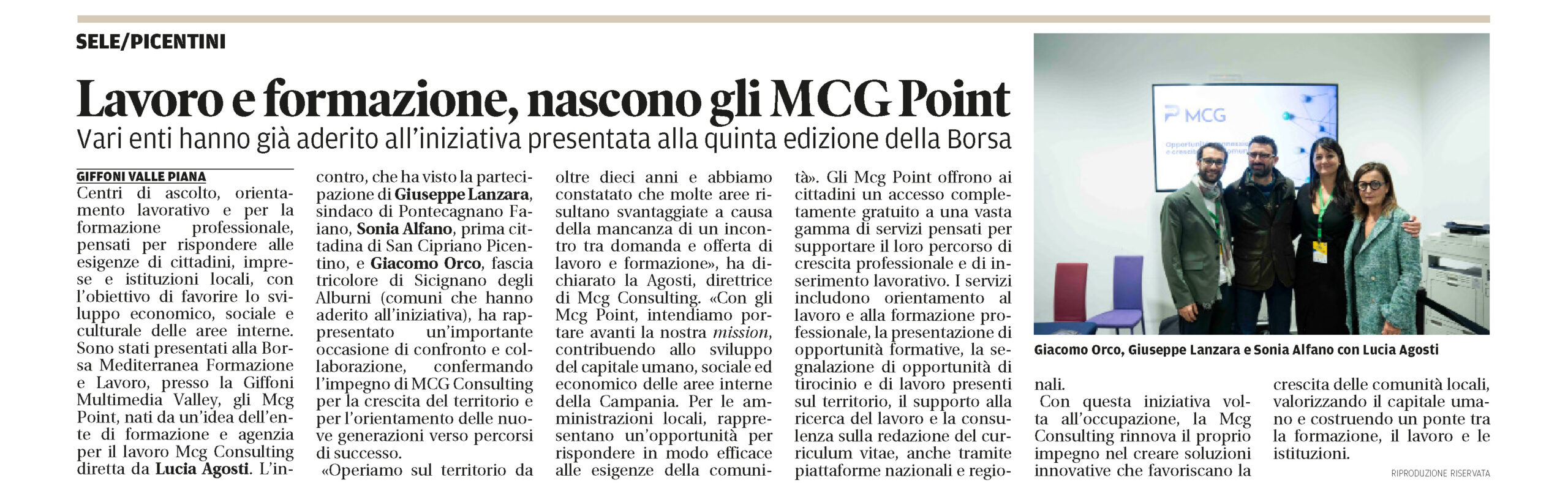 Sul quotidiano La Città di Salerno un approfondimento dedicato alla nostra iniziativa, gli MCG Point, promossa per offrire servizi di orientamento alla formazione e al lavoro nei territori delle aree interne della Campania.