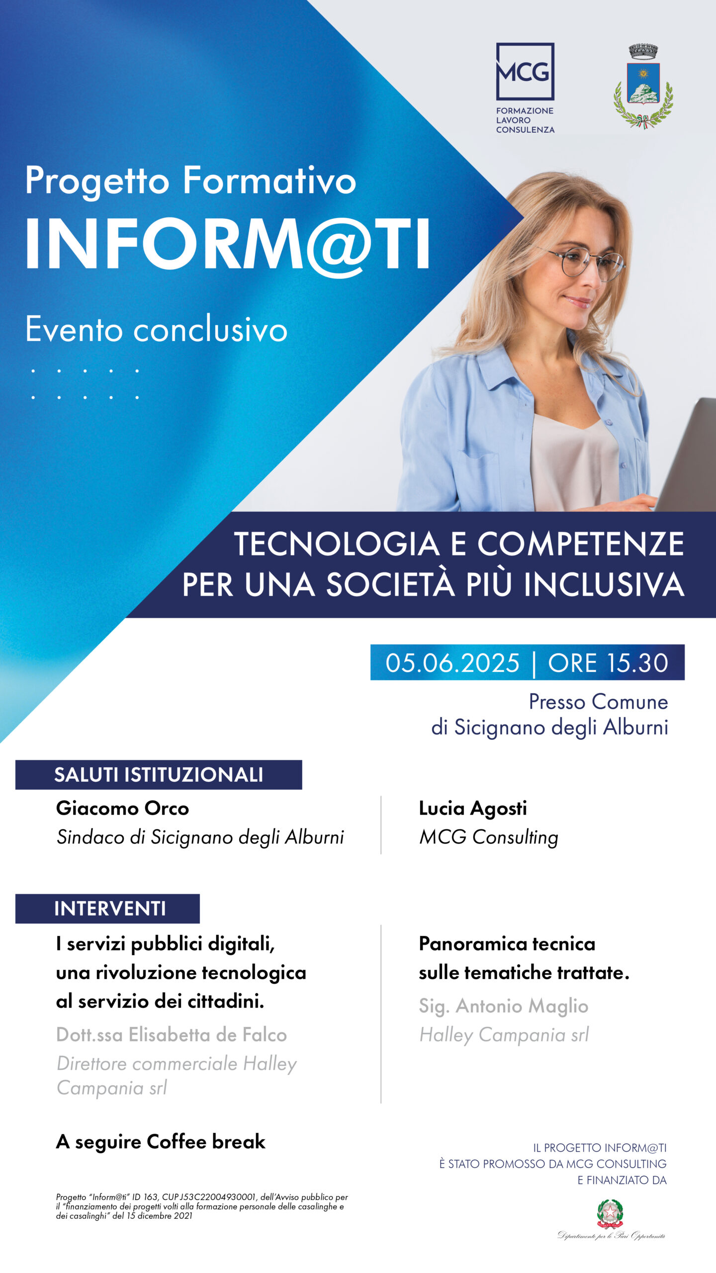 L’evento conclusivo dal titolo “Tecnologie e competenze per una società più inclusiva” si terrà il 5 giugno 2025 alle ore 15:30 presso il Comune di Sicignano degli Alburni, ente partner del progetto. L’incontro rappresenta un momento di confronto pubblico sui risultati raggiunti e sulle prospettive future della formazione digitale inclusiva.