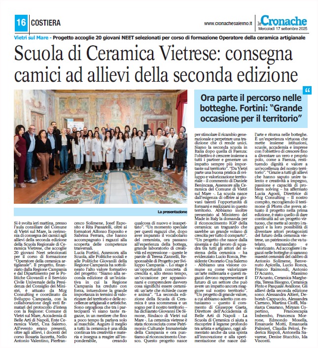 “Grazie a tutti gli allievi che hanno saputo unire talento e creatività a impegno, passione e capacità di problem solving – ha affermato Lucia Agosti, Direttrice di MCG Consulting – Il nostro compito, raccogliendo il testimone di Pform che aveva attuato il progetto nella prima edizione, è stato quello di dare continuità ad un progetto virtuoso, che mette al centro i ragazzi e la loro possibilità di diventare attori protagonisti del futuro della ceramica vietrese, un patrimonio che va tutelato, tramandato e valorizzato.
